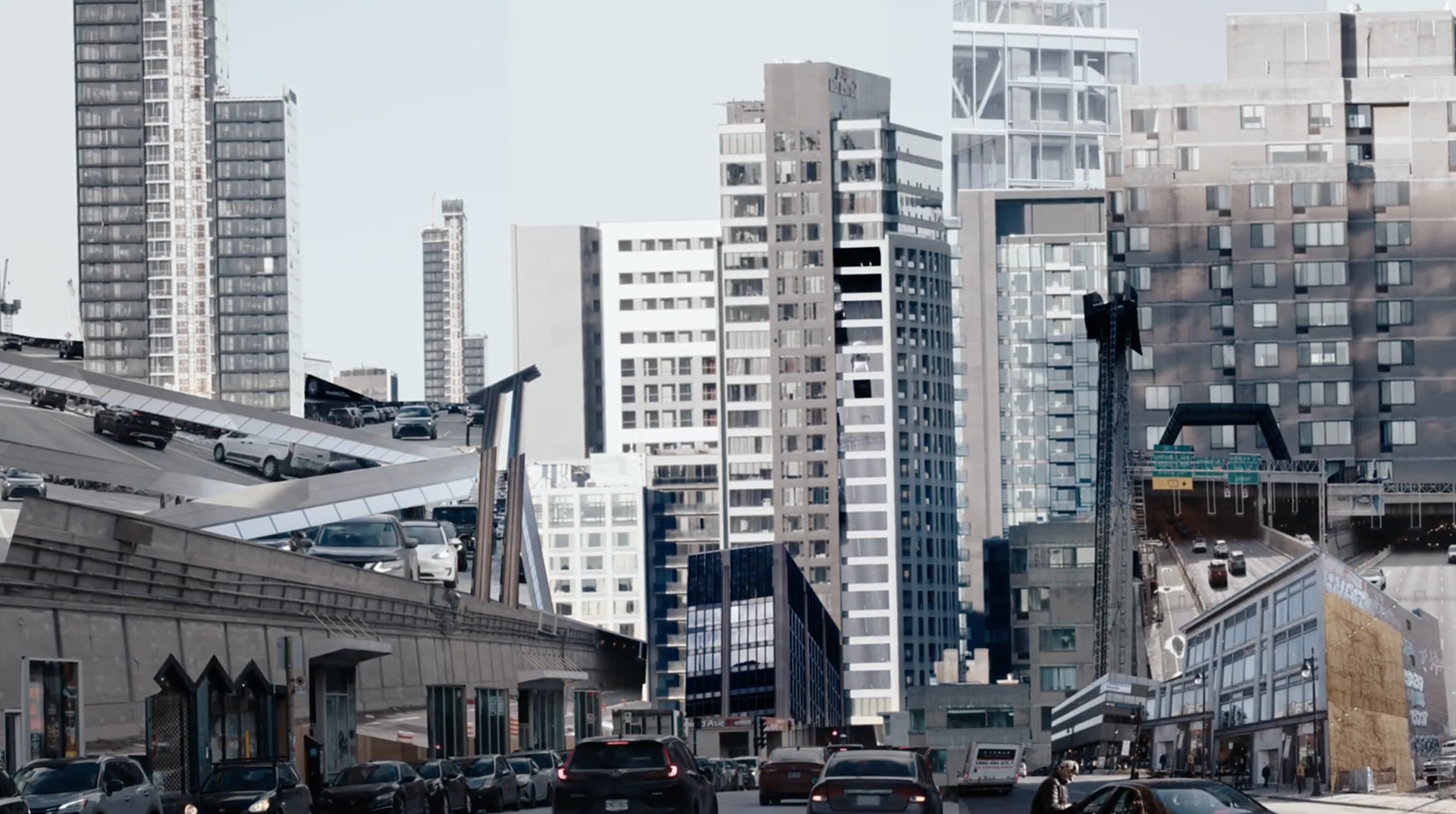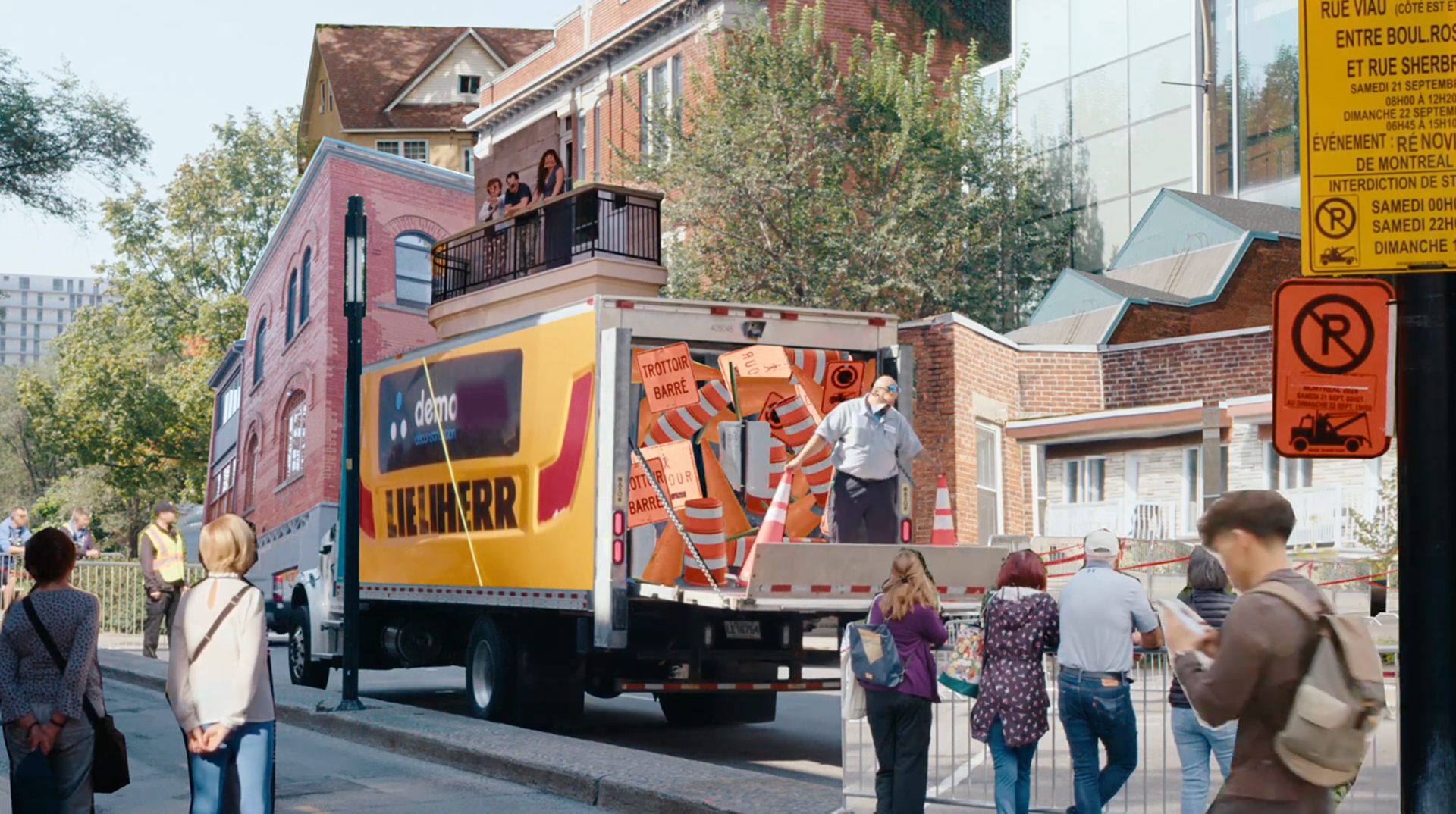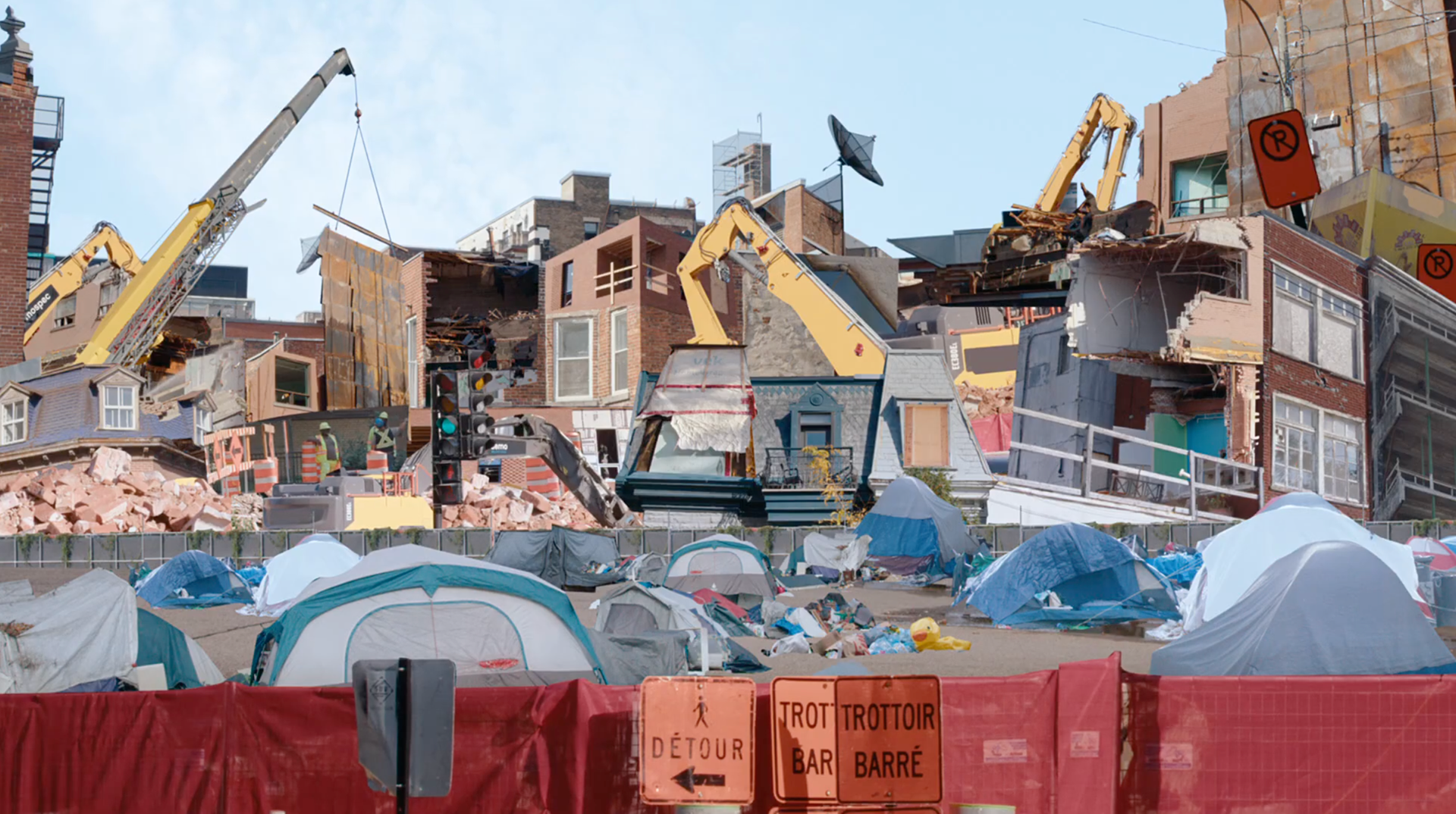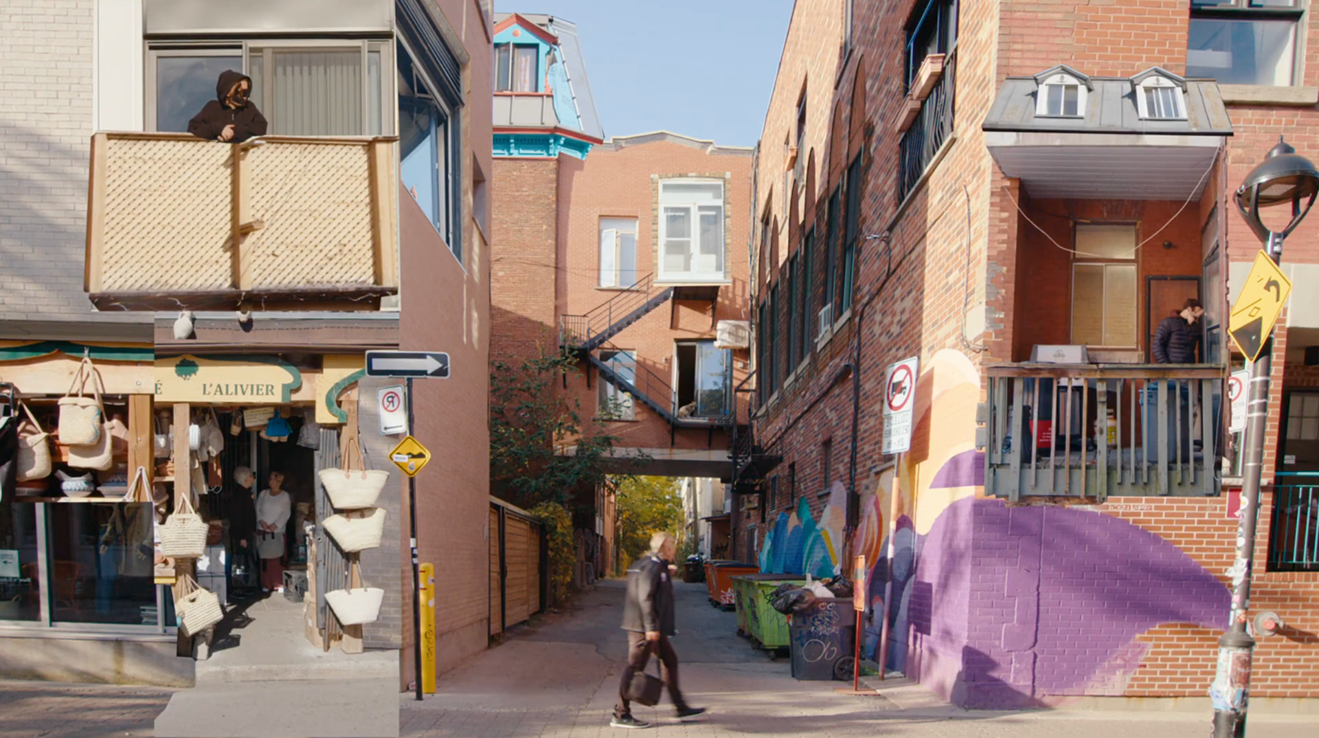 Les Montréalais profitent des parcs, des balcons, des cafés et des pistes cyclables, partageant une diversité culturelle riche. Mais un camion rempli de cônes orange perturbe les quartiers, laissant derrière lui des chantiers qui transforment la ville. Le patrimoine bâti disparaît, remplacé par des bâtiments si hauts qu’ils plongent Montréal dans l’ombre. À l'ère cyberpunk, les rues sont dominées par les tours IA qui effacent les derniers vestiges du passé. Une révolte réclame un changement radical. Quand tout s'effondre, la nature reprend ses droits. Parmi les ruines, une communauté solarpunk émerge où la vie s’adapte à son environnement.
